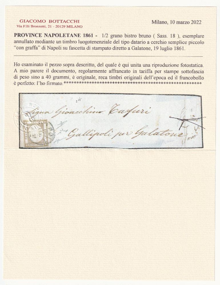 | Zusatzinformationen und Suchstichworte: | Tuscanphila 1. Auktion 23. September 2023 Los 148 Italien Staaten Neapel 1861 19 Lug 1/2 gr. isolato Sassone 18 ben marginato su fascetta intera da Napoli x Galatone Cert. Bott. F.Sorani, Gazzi, Chiav. Ex Coll. Imperato uso molto raro su fascetta e Spl Ausruf 1.500,00 EUR |