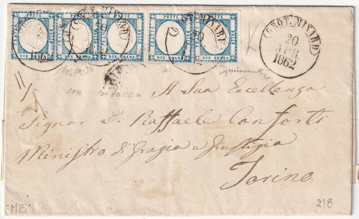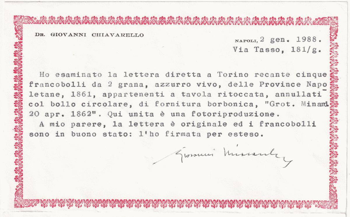 | Zusatzinformationen und Suchstichworte: | Tuscanphila 1. Auktion 23. September 2023 Los 178 Italien Staaten Neapel 1862 20 Apr. 2 gr. x 5 es. tutti dalla Tavola Ritoccata con mancanze di stampa Sassone 20b su lettera da Grottaminarda Pt.6 x Torino Cert.Chiav. f.Bott, esteso Chiav, Gazzi, Caffaz Ex Coll. Imperato rarissima Ausruf 380,00 EUR |
