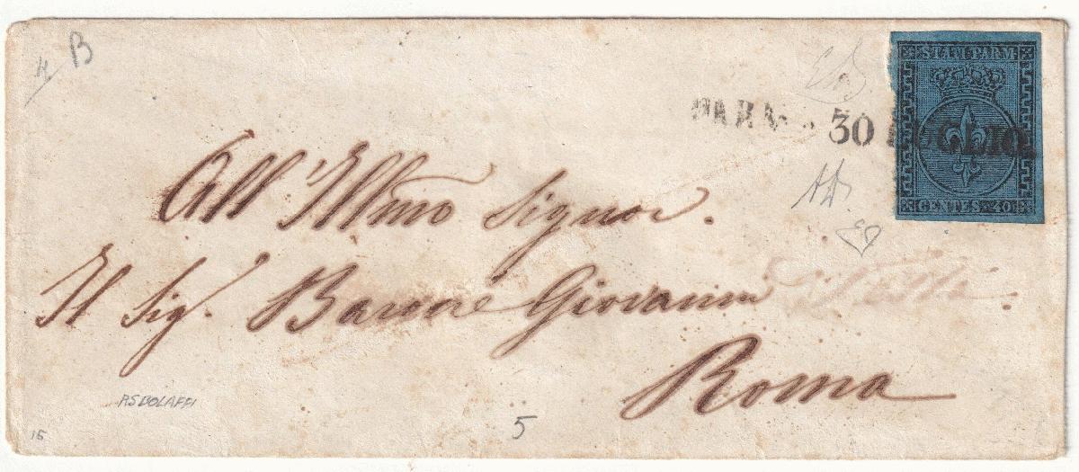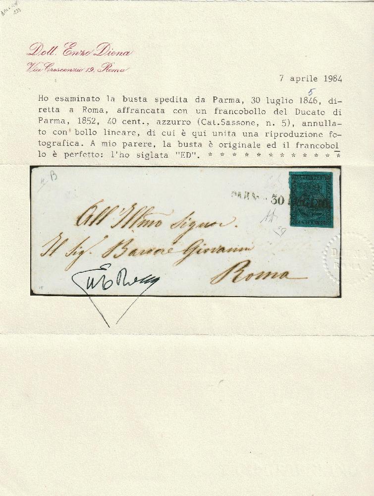 | Zusatzinformationen und Suchstichworte: | Tuscanphila 1. Auktion 23. September 2023 Los 183 Italien Staaten Parma 1856 30 Lug 40 c. azzurro Sassone 5 marginato su bustina da Parma x Roma Cert.Ed f.AD,Bolaffi , Em.D. Prezzo di catalogo: 5250 Ausruf 500,00 EUR |