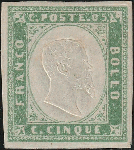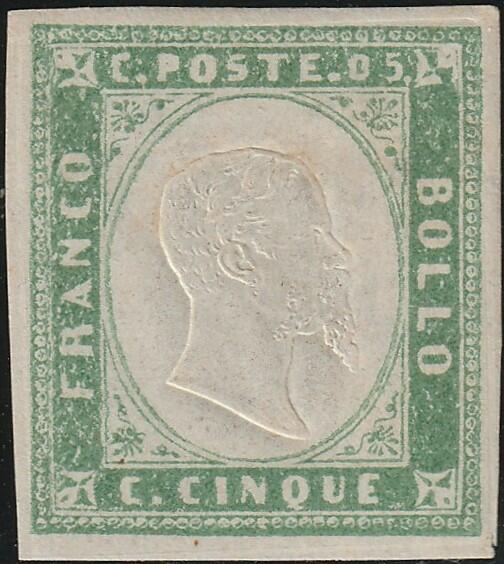 | Zusatzinformationen und Suchstichworte: | Tuscanphila 1. Auktion 23. September 2023 Los 239 Italien Staaten Sardinien IV^ Em. 5 c. verde pisello I^ Tav. Sassone 13c grandi margini MLH* Cert.Colla f.esteso Giulio Bolaffi Ex Coll. Nodo probabilmente il migliore noto di questa rara tinta Ausruf 4.000,00 EUR |