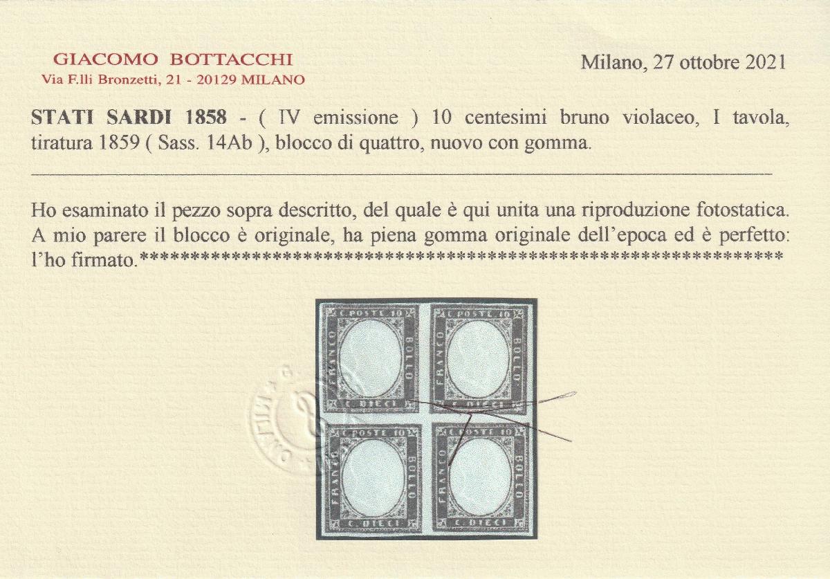 | Zusatzinformationen und Suchstichworte: | Tuscanphila 1. Auktion 23. September 2023 Los 242 Italien Staaten Sardinien IV^ Em. 10 c. bruno violaceo I^ Tav. Quartina Sassone 14Ab ben marginata MNH**/MLH* Cert.Bottacchi f.esteso Giulio Bolaffi, AD Ex Coll. Nodo eccezionale Ausruf 1.250,00 EUR |