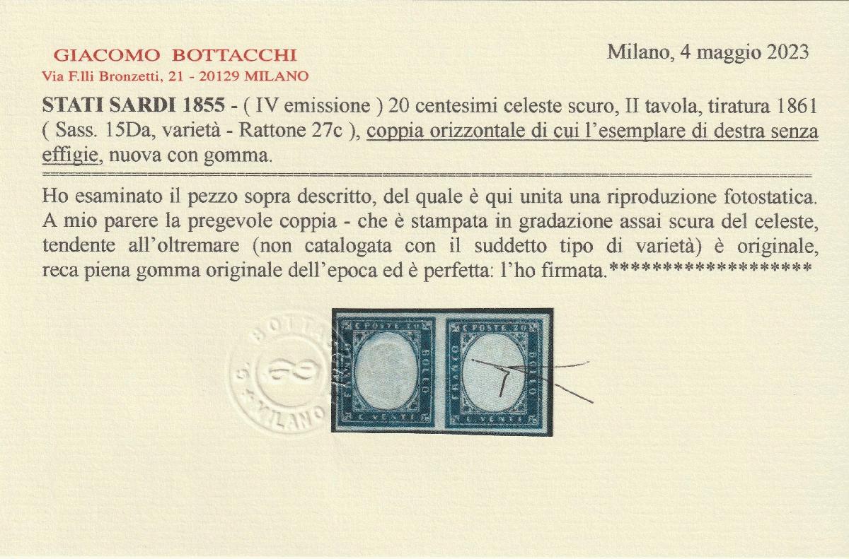 | Zusatzinformationen und Suchstichworte: | Tuscanphila 1. Auktion 23. September 2023 Los 259 Italien Staaten Sardinien IV^ Em. 20 c. celeste scuro II^ Tav. tendente oltremare coppia con e senza Effigie Sassone 15Da marginata MNH**/MVLH* con 3 Cert.Bott+Cilio+Chiav. Varietà Non catalogata e Spl Ausruf 1.000,00 EUR |