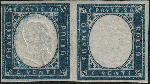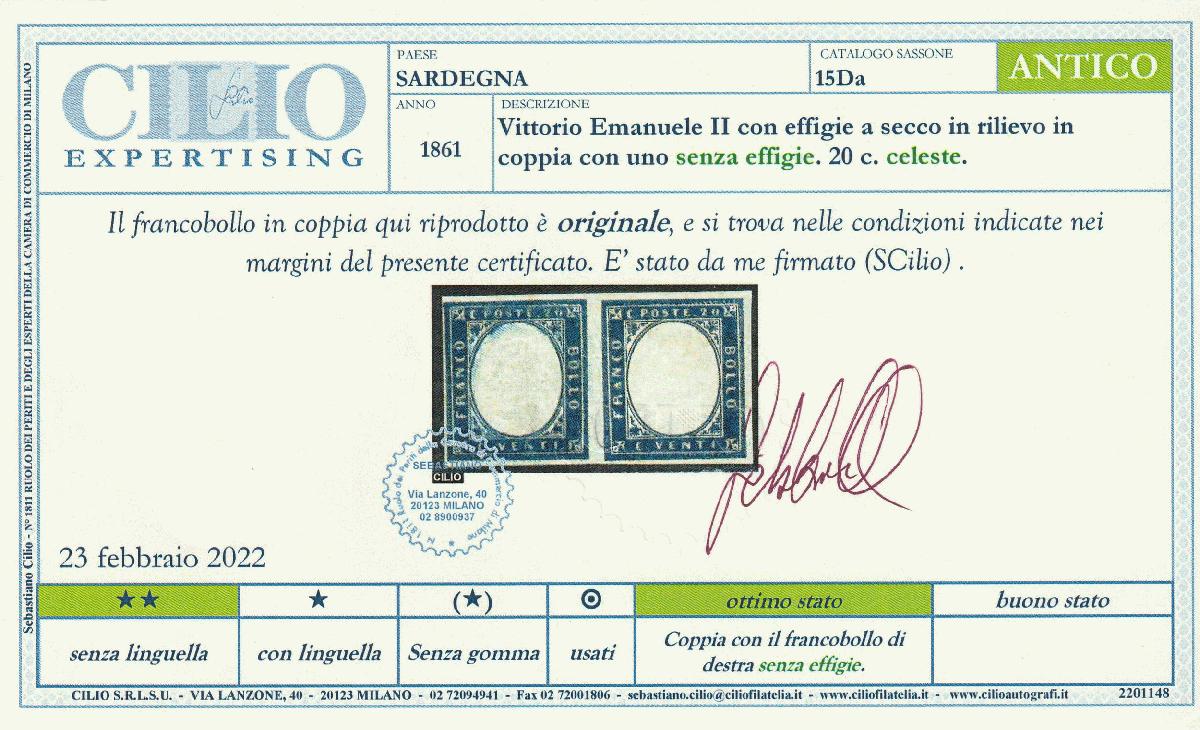 | Zusatzinformationen und Suchstichworte: | Tuscanphila 1. Auktion 23. September 2023 Los 259 Italien Staaten Sardinien IV^ Em. 20 c. celeste scuro II^ Tav. tendente oltremare coppia con e senza Effigie Sassone 15Da marginata MNH**/MVLH* con 3 Cert.Bott+Cilio+Chiav. Varietà Non catalogata e Spl Ausruf 1.000,00 EUR |