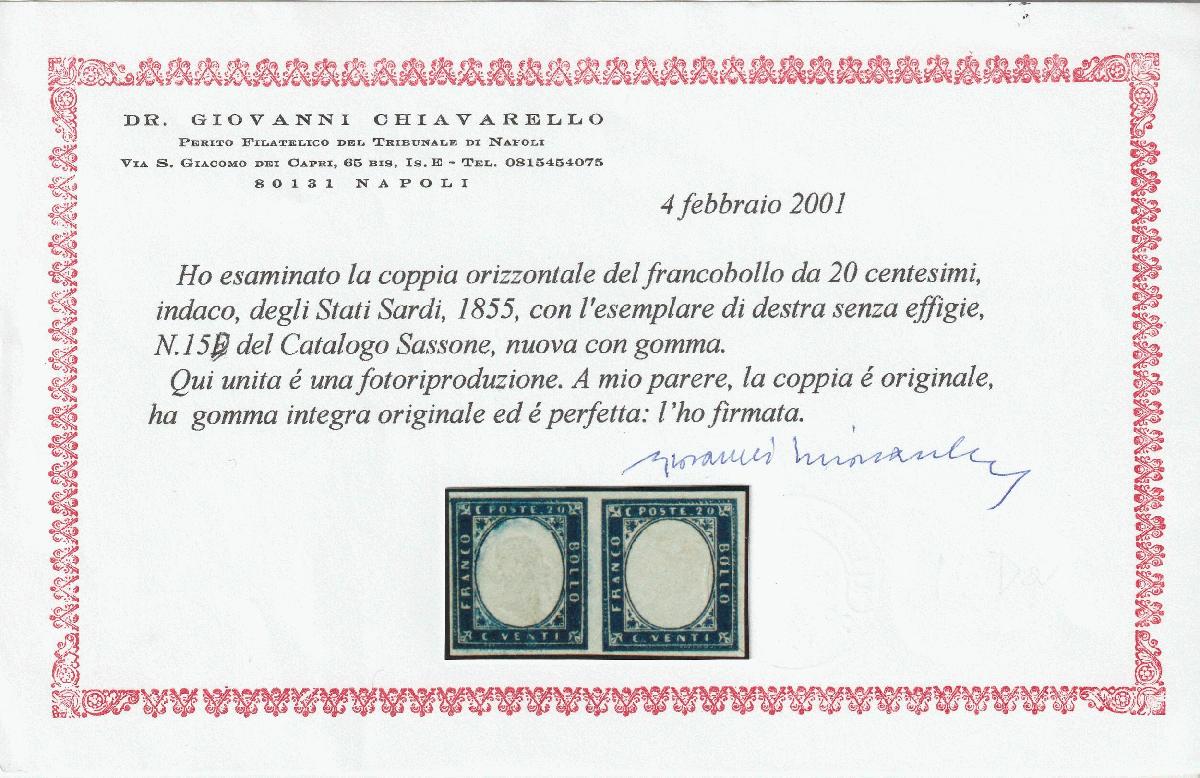 | Zusatzinformationen und Suchstichworte: | Tuscanphila 1. Auktion 23. September 2023 Los 259 Italien Staaten Sardinien IV^ Em. 20 c. celeste scuro II^ Tav. tendente oltremare coppia con e senza Effigie Sassone 15Da marginata MNH**/MVLH* con 3 Cert.Bott+Cilio+Chiav. Varietà Non catalogata e Spl Ausruf 1.000,00 EUR |