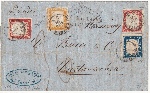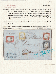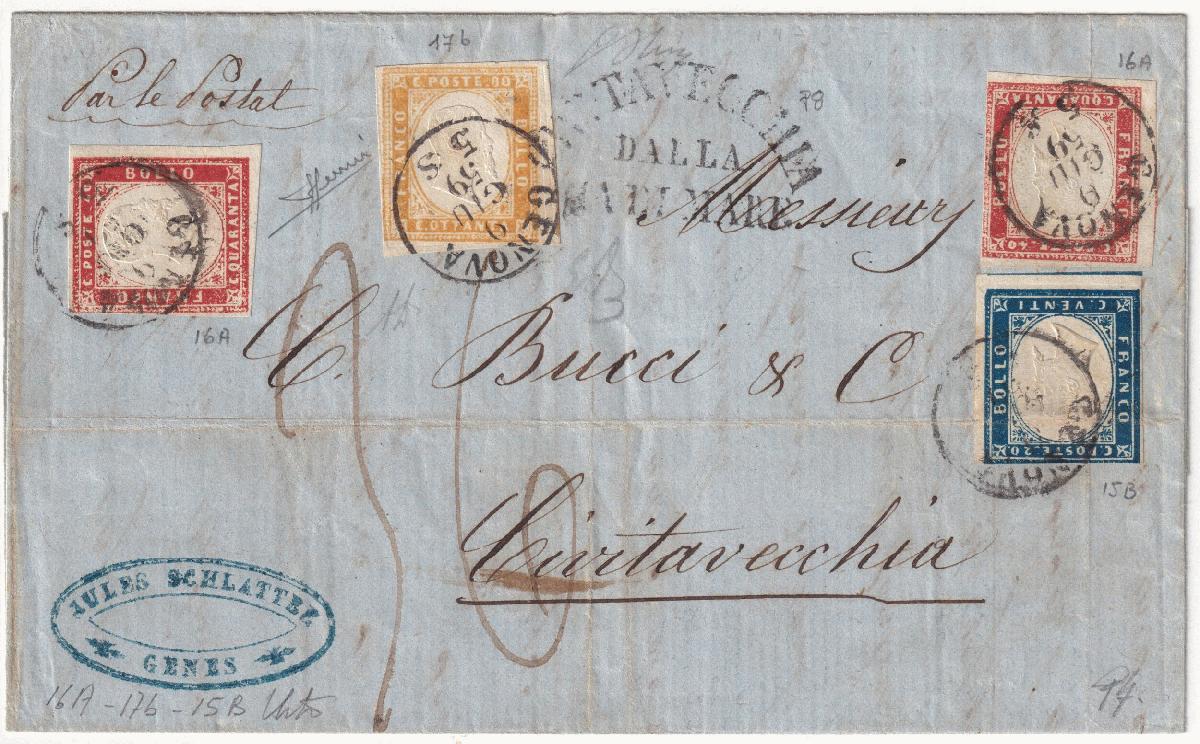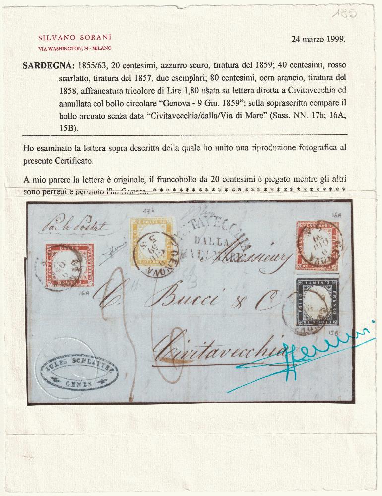 | Zusatzinformationen und Suchstichworte: | Tuscanphila 1. Auktion 23. September 2023 Los 285 Italien Staaten Sardinien 1859 9 Giu Tricolore Via di Mare 20+40+40+80 c. Sassone 17b+16A+15B su lettera da Genova x Civitavecchia Pt.8 tassata 36 baj Cert.Sorani f.AD, Ball,Oliva, Em.D Ex Coll. Hess Ausruf 1.000,00 EUR |