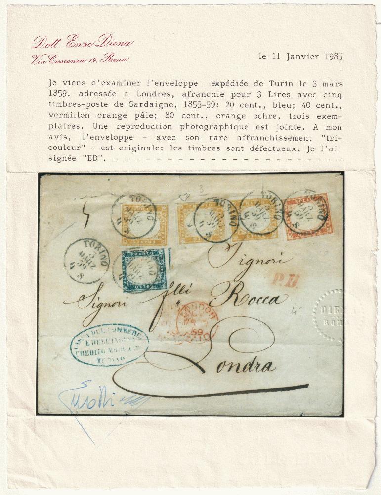 | Zusatzinformationen und Suchstichworte: | Tuscanphila 1. Auktion 23. September 2023 Los 286 Italien Staaten Sardinien 1859 3 Mar Tricolore 20+40+80+80+80 c. Sassone 15A+16Ab+17b con difetti su busta da Torino 5 porti totali 3 lire x Londra Cert.Bolaffi+ED f.Chia.A.Bolaffi Ex Collezione Imperato rarissima Ausruf 4.500,00 EUR |