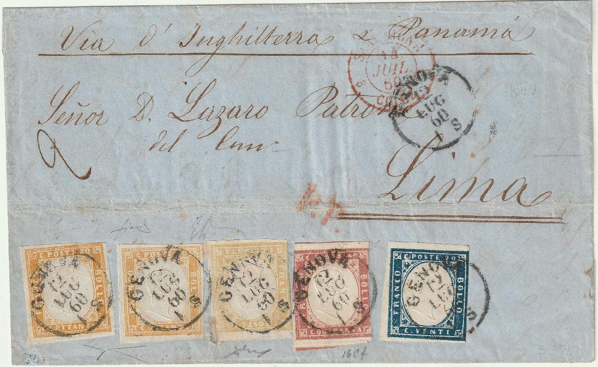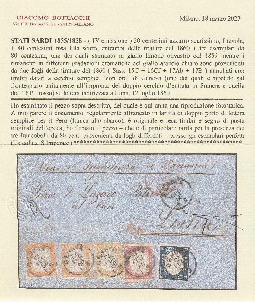 | Zusatzinformationen und Suchstichworte: | Tuscanphila 1. Auktion 23. September 2023 Los 290 Italien Staaten Sardinien 1860 12 Lug Pentacolore transatlantica 20+40 rosa lilla sc.+80 x 3 tinte diverse Sassone 15C+16Cf+17Ab+17B su lettera da genova x Lima via Panama dettagliato Cert.Bott+Fiecchi f. Chiav, Em.D Ex Coll. Imperato Unica !! Ausruf 10.000,00 EUR |