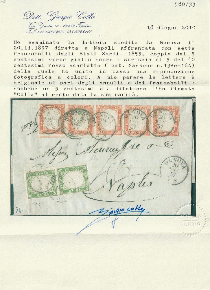 | Zusatzinformationen und Suchstichworte: | Tuscanphila 1. Auktion 23. September 2023 Los 292 Italien Staaten Sardinien 1857 20 Nov. 5 c. coppia + 40 c. striscia di 4 Sassone 13Ae+16A su lettera da Genova x Napoli tassata 40 gr. Cert. Colla+AD Ex Coll. Hess rara Ausruf 1.000,00 EUR |