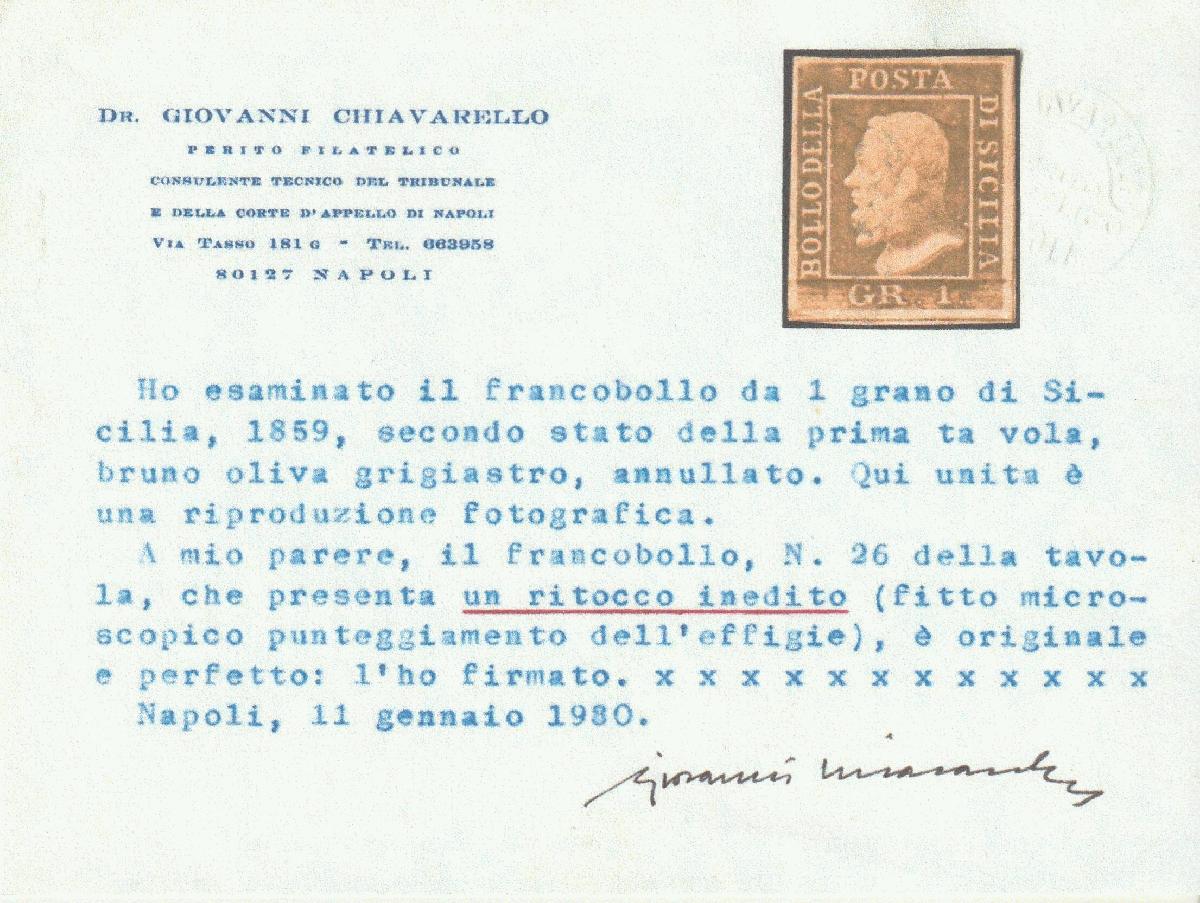 | Zusatzinformationen und Suchstichworte: | Tuscanphila 1. Auktion 23. September 2023 Los 315 Italien Staaten Sizilien 1 gr. I^Tav. II° Stato bruno oliv. Pos.26 con Ritocco Inedito Sassone 3d VAR ben marginato usato 4 Cert.Chiav,Ray,Gazzi + articolo Chiavarello su questo rarissimo Ritocco Ausruf 1.000,00 EUR |