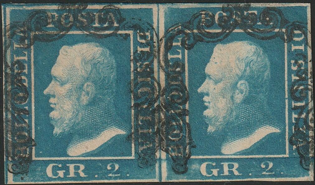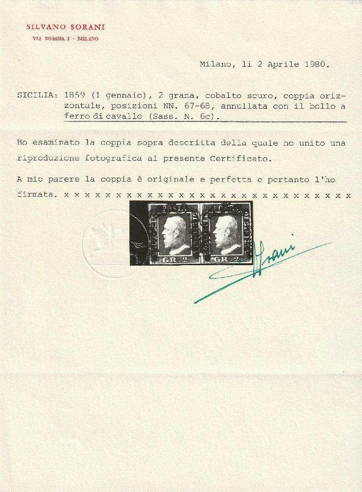 | Zusatzinformationen und Suchstichworte: | Tuscanphila 1. Auktion 23. September 2023 Los 318 Italien Staaten Sizilien 2 gr. I^ Tav. cobalto scuro NA coppia pos.67-68 Sassone 6c marginata usata Cert.Sorani f.Pal,Chiav., Em.D. Prezzo di catalogo: 2250 Ausruf 200,00 EUR |