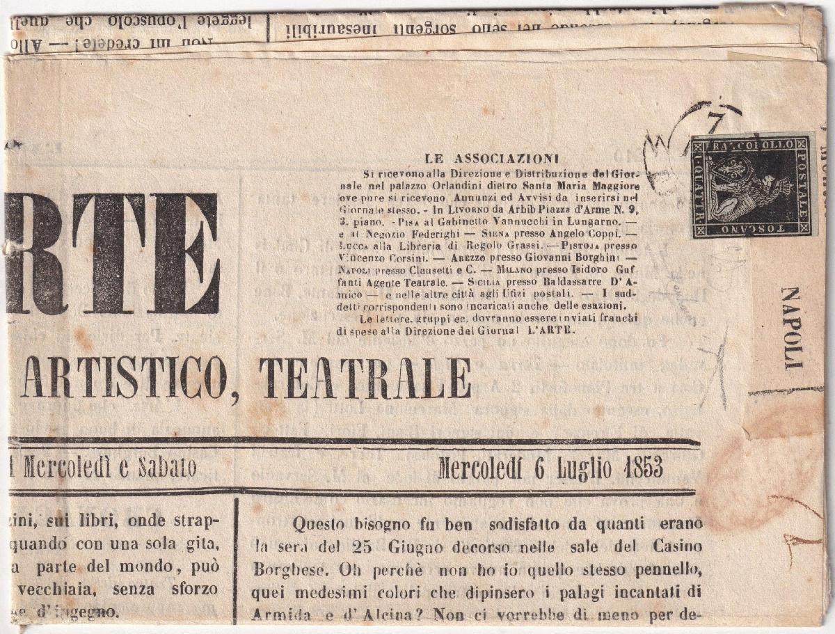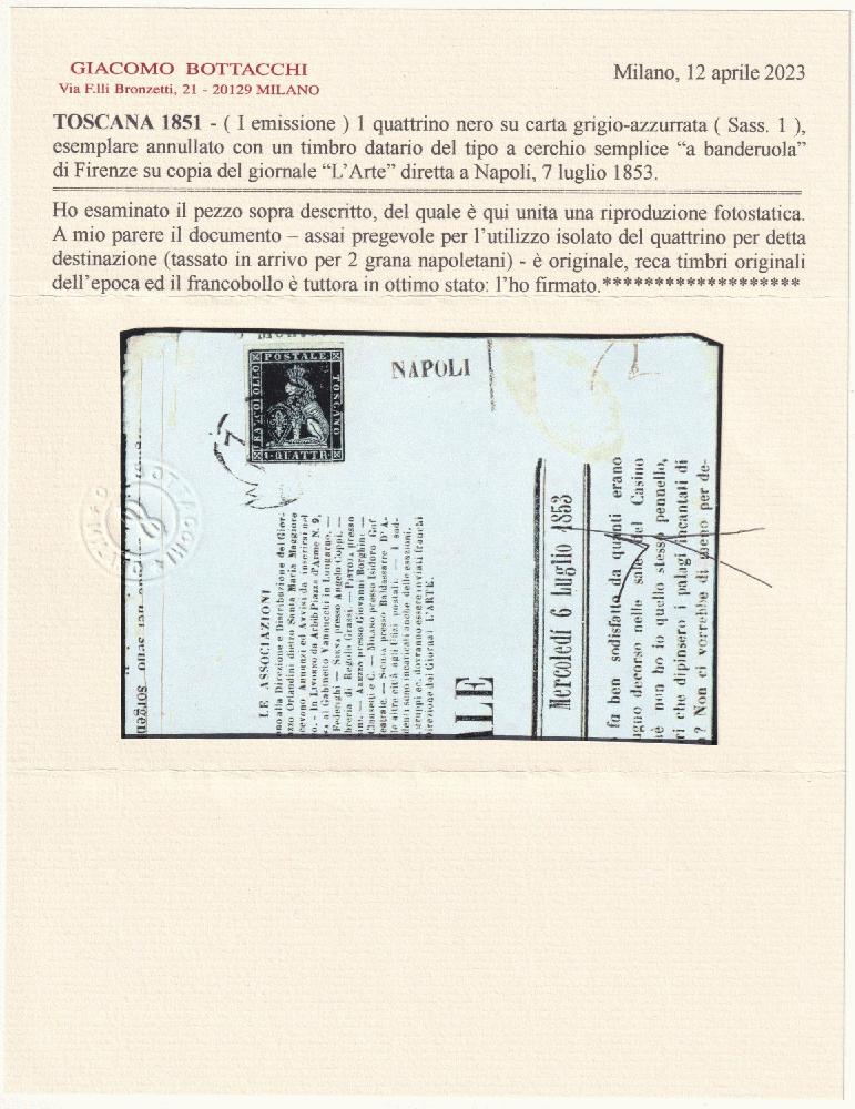 | Zusatzinformationen und Suchstichworte: | Tuscanphila 1. Auktion 23. September 2023 Los 339 Italien Staaten Toscana 1853 7 Lug 1 q. nero Sassone 1 marginato su Giornale intero L'Arte da Firenze x Napoli Cert.Bottacchi f.Ray,Em.D Ex Coll. Imperato raro documento x rara destinazione Ausruf 2.000,00 EUR |