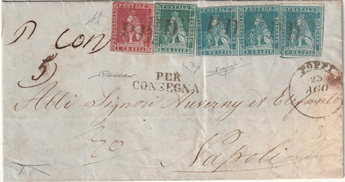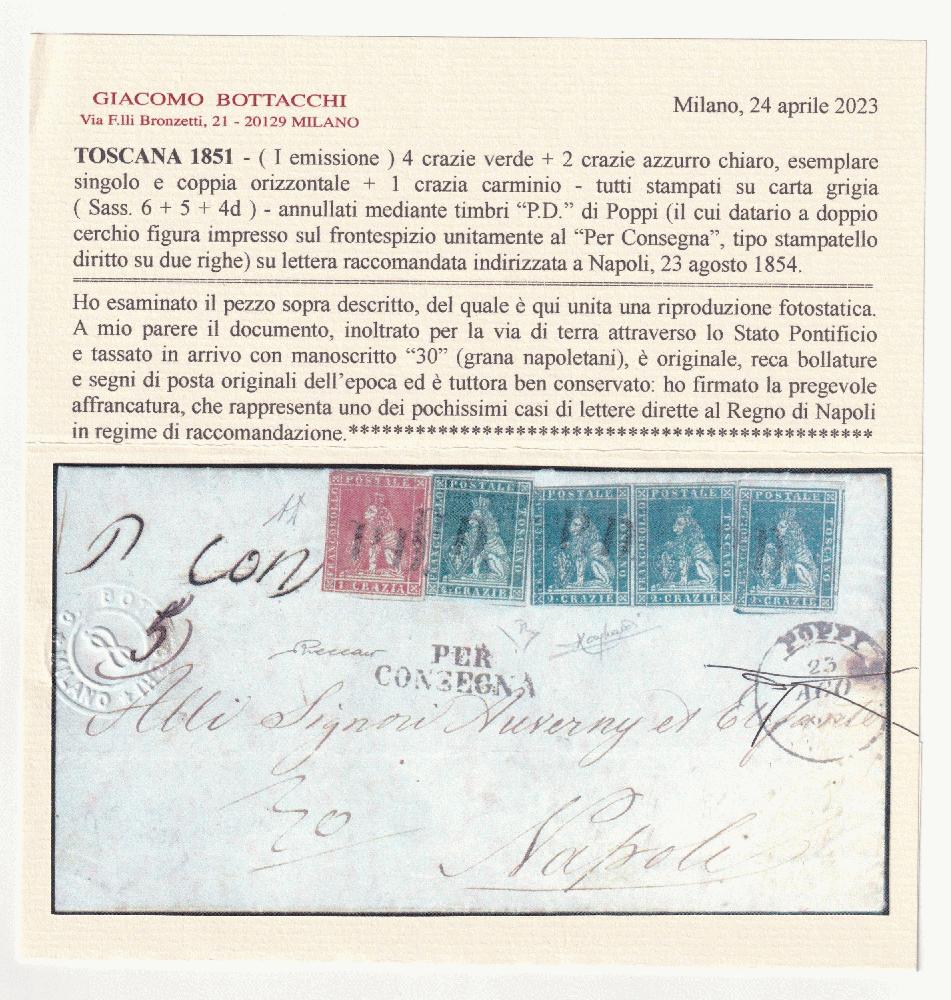 | Zusatzinformationen und Suchstichworte: | Tuscanphila 1. Auktion 23. September 2023 Los 341 Italien Staaten Toscana 1854 23 Ago Tricolore 1 cr. + 2 cr. coppia + 2 cr. + 4 cr. Sassone 4d+5+6 su raccomandata da Poppi x Napoli Cert.Bottacchi f.Ed,Vacc,Ad, Ray Ex Coll. Imperato insieme pressochè Unico !!! Ausruf 5.000,00 EUR |