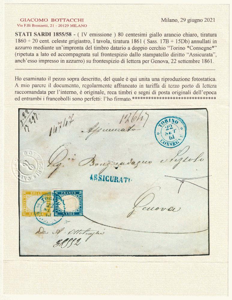 | Zusatzinformationen und Suchstichworte: | Toscanphila 1. Auktion 23. September 2023 Los 359 Italien Königreich 1861 22 Set 20+80 c. Sassone 17B+15Db marginati su fronte raccomandato da Torino annulli tutti azzurri x Genova 3° porto Cert.Bott. Ex Coll. Hess rara Ausruf 350,00 EUR |