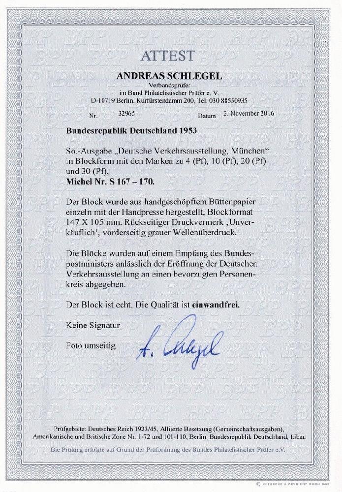 | Zusatzinformationen und Suchstichworte: | ebay.de Los T158 RARITÄT: BRD S 167-S170 Verkehrsausstellung postfrisch Attest Schlegel BPP Ausruf 7.850,00 EUR |