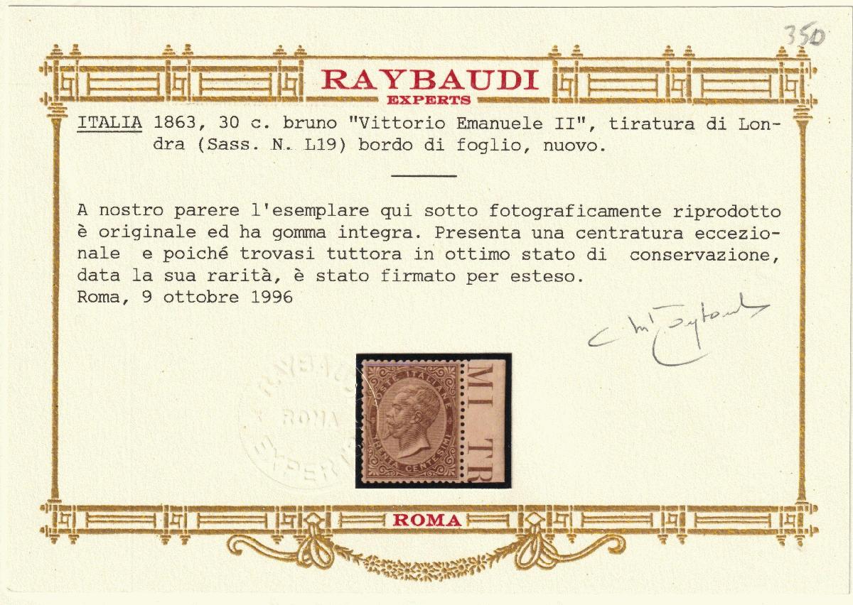 | Zusatzinformationen und Suchstichworte: | Toscanphila 1. Auktion 23. September 2023 Los 378 Italien Königreich DLR Tir. Di Londra 30 c. bruno Sassone L19 ampio Bdf centratssimo MNH** Cert.ORO Raybaudi "…centratura eccezionale…" f.AD rarissimo tra i migliori noti o il migliore noto. Prezzo di catalogo: 55000 Ausruf 10.000,00 EUR |