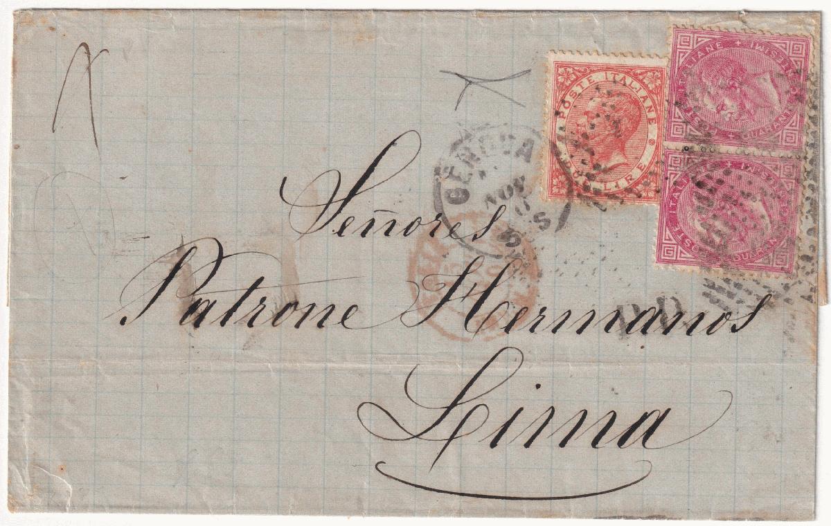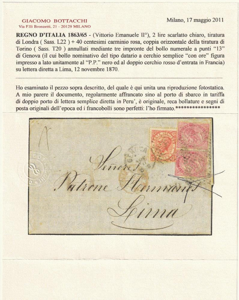 | Zusatzinformationen und Suchstichworte: | Toscanphila 1. Auktion 23. September 2023 Los 382 Italien Königreich 1870 13 Nov 2 l.DLR + 40 c. coppia Sassone T20+L22 su lettera da Genova x Lima doppio porto Cert.Bottacchi Ex Coll. Hess rara tariffa e destinazione Ausruf 1.250,00 EUR |