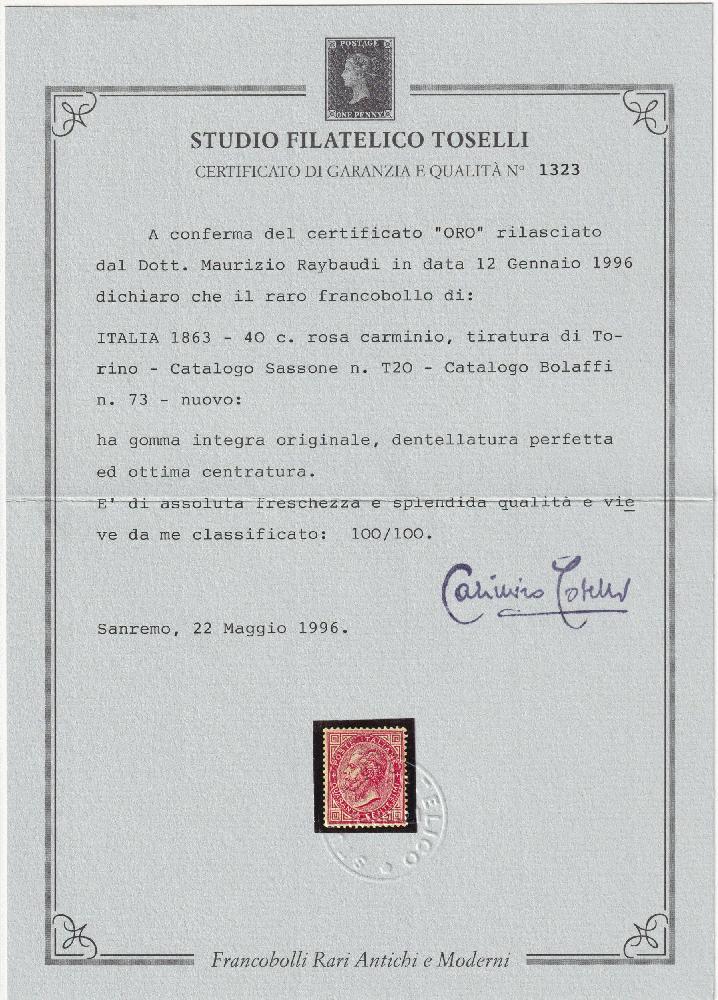 | Zusatzinformationen und Suchstichworte: | Toscanphila 1. Auktion 23. September 2023 Los 387 Italien Königreich Tir.di Torino 40 c. rosso carminio Sassone T20 centratissimo MNH** Cert.ORO raybaudi + Cert. Toselli 100% f.AD rarissimo e Spl. Prezzo di catalogo: 60000 Ausruf 5.500,00 EUR |