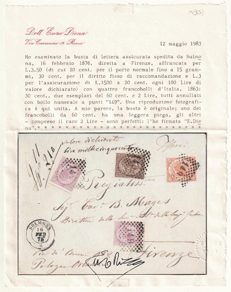 | Zusatzinformationen und Suchstichworte: | Toscanphila 1. Auktion 23. September 2023 Los 416 Italien Königreich 1876 16 Feb Tricolore 2 l. + 30 c. + 60 c. x 2 Sassone T19+T21+T22 su assicurata L.1.500 da Solmona x Firenze Cert.Ed F.Gazzi Ex Coll. Hess rara Ausruf 850,00 EUR |