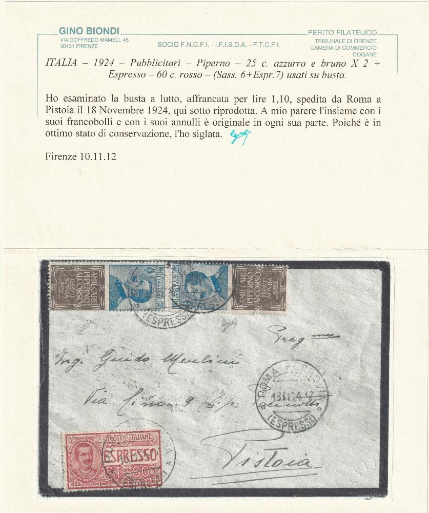 | Zusatzinformationen und Suchstichworte: | Toscanphila 1. Auktion 23. September 2023 Los 429 Italien Königreich 1924 13 Nov Piperno 25 c. x 2 + Exp 60 c. Sassone 6+E7 su busta espresso da Roma x Pistoia Cert.Mosc.+Biondi Ex Coll Hess rara Ausruf 1.000,00 EUR |