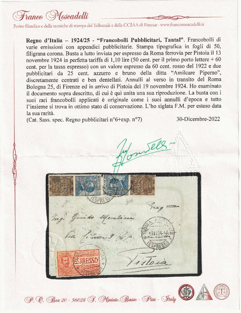| Zusatzinformationen und Suchstichworte: | Toscanphila 1. Auktion 23. September 2023 Los 429 Italien Königreich 1924 13 Nov Piperno 25 c. x 2 + Exp 60 c. Sassone 6+E7 su busta espresso da Roma x Pistoia Cert.Mosc.+Biondi Ex Coll Hess rara Ausruf 1.000,00 EUR |