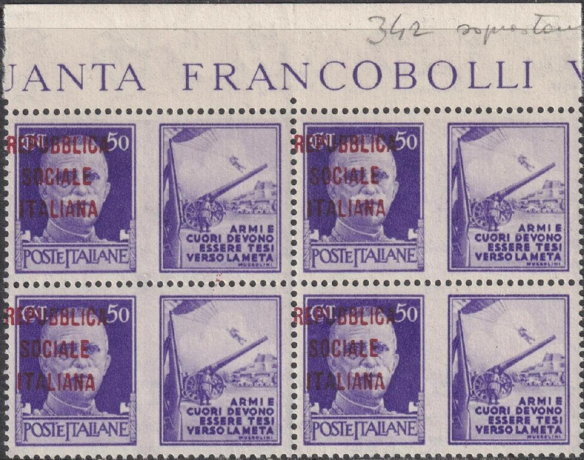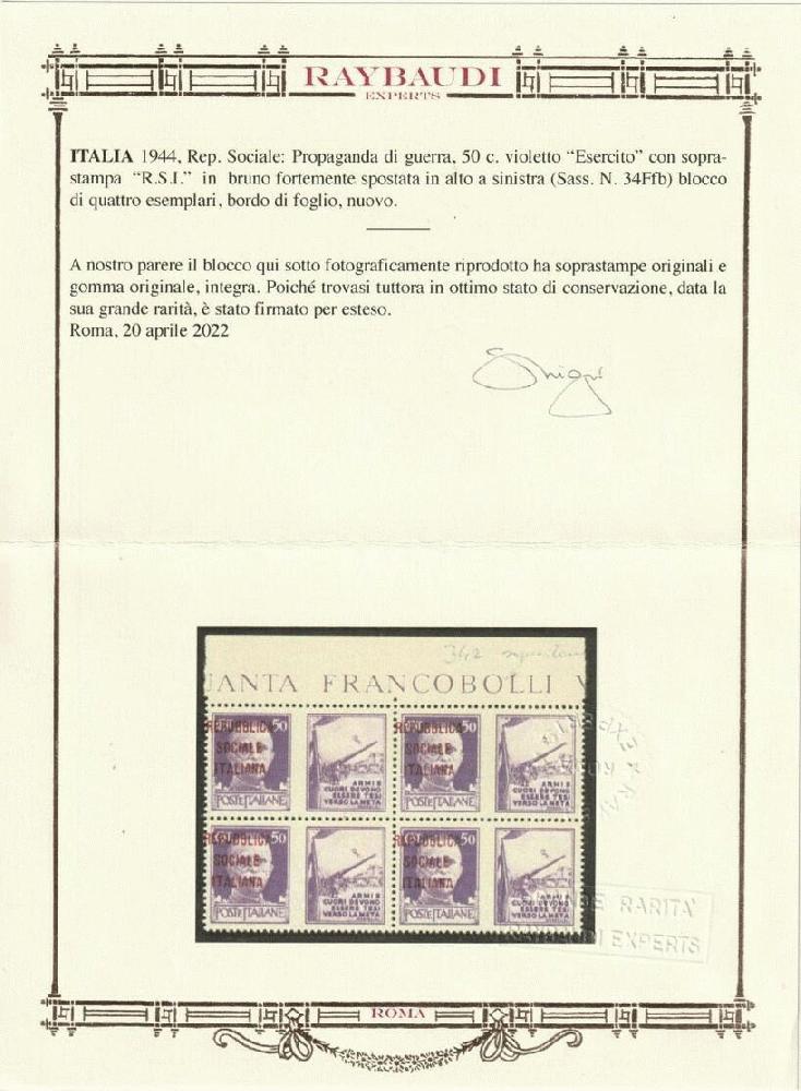 | Zusatzinformationen und Suchstichworte: | Toscanphila 1. Auktion 23. September 2023 Los 488 Italien Republik Soziale Italiano Propaganda di Guerra 50 c. violetto Soprastampa bruna fort. Spostata in alto a sx Quartina Sass.34Ffb Bdf MNH** Cert.ORO Raybaudi rara e Spl. Prezzo di catalogo: 20000 Ausruf 1.000,00 EUR |