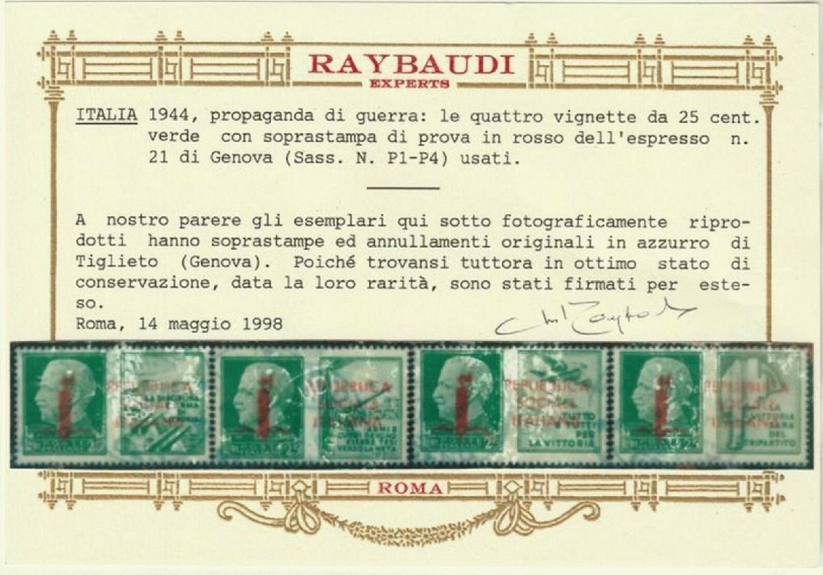 | Zusatzinformationen und Suchstichworte: | Toscanphila 1. Auktion 23. September 2023 Los 490 Italien Republik Soziale Italiano Propagnada di Guerra Tir. Genova Saggi di Genova Serie Completa da 25 c. Sass.P1/P4 usata a Tiglieto (nota Sassone ) Cert.ORO Raybaudi rarissima Non Quotati e Spl Ausruf 2.000,00 EUR |