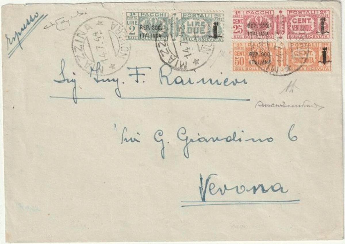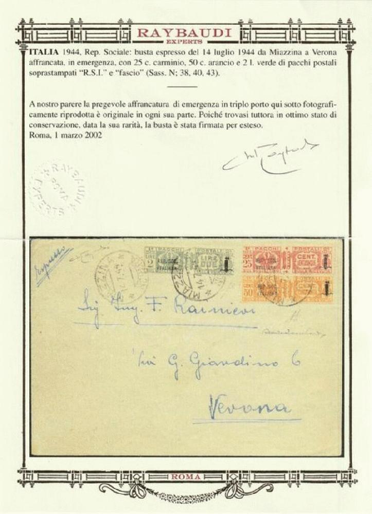 | Zusatzinformationen und Suchstichworte: | Toscanphila 1. Auktion 23. September 2023 Los 496 Italien Republik Soziale Italiano 1944 14 Lug. Pacchi Postali 25+50 c. + 2 l. Sass.38+40+43 su espresso da Miazzina x Verona Cert.ORO Raybaudi f.AD, Donnini estremante rara e Spl. Prezzo di catalogo: 45300 Ausruf 4.500,00 EUR |