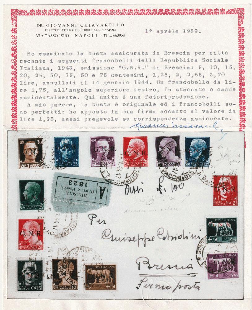 | Zusatzinformationen und Suchstichworte: | Toscanphila 1. Auktion 23. September 2023 Los 456 Italien Militärpost Ausgaben Guardia Nazionale 1944 14 Gen Tir. Di Brescia eccezionale affrancatura di 14 valori diversi Sassone 470/I-480/I+482/I-484/I su assicurata da Brescia x città Cert.ORO Ray+ Chiav rarissima e Spl. Prezzo di catalogo: 50000 Ausruf 4.000,00 EUR |