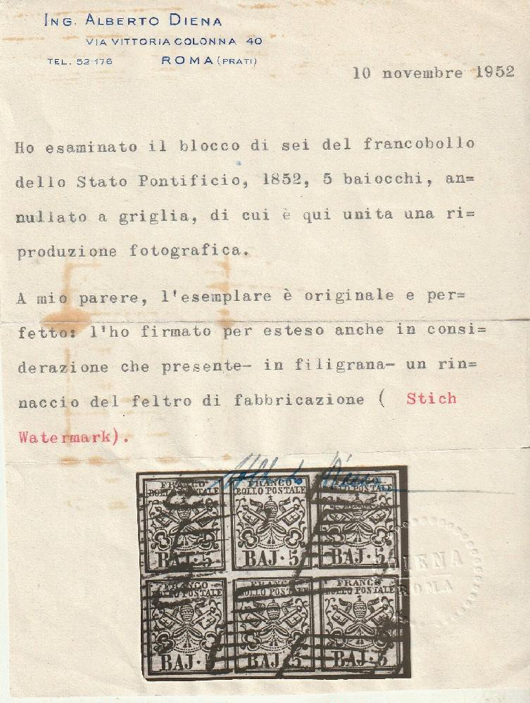 | Zusatzinformationen und Suchstichworte: | Toscanphila 1. Auktion 23. September 2023 Los 192 Italien Staaten Kirchenstaat I^ Em. 5 b. Filigrana di Ricucitura completa a sx Blocco di 6 Sassone 6+6f grandi margini usato Cert.AD f.esteso Giulio Bolaffi EX Coll. Imperato il più grande blocco noto e lusso Ausruf 2.000,00 EUR |