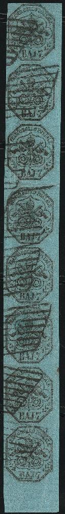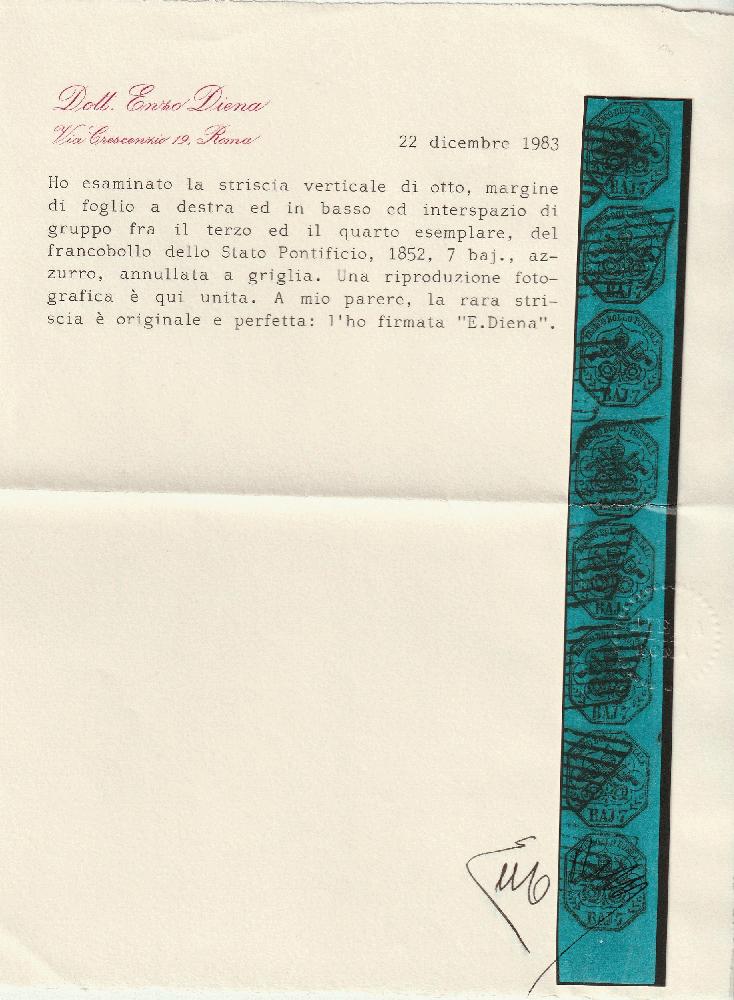| Zusatzinformationen und Suchstichworte: | Toscanphila 1. Auktion 23. September 2023 Los 196 Italien Staaten Kirchenstaat I^ Em. 7 b. azzurro oleoso striscia verticale di 8 con Interspazio Sassone 8b VAR Bdf ben marginata Cert.ED Ex Coll. Imperato massima striscia nota e Spl. Prezzo di catalogo: 60000 Ausruf 5.000,00 EUR |