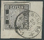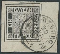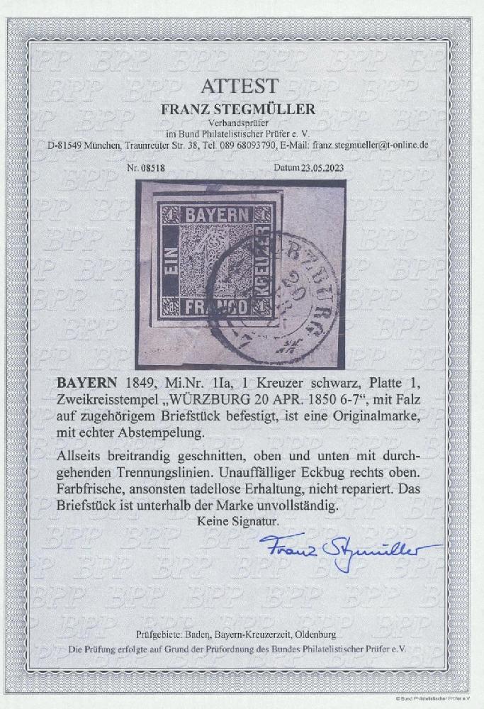 | Zusatzinformationen und Suchstichworte: | Ulrich Felzmann 37. e@uction 5. - 8. September 2023 Los 12011 Altdeutschland Bayern 1 Kr schwarz, Platte I, ringsum besonders breitrandig mit oben und unten durchgehenden Trennungslinien, bis auf einen unauffälligen Eckbug rechts oben tadellos, mit zugehörigem, unterhalb der Marke unvollständigem Briefstück, wodurch der besonders saubere K2 WÜRZBURG 20 APR. 1850 hervorragend zur Geltung kommt, Fotoattest Stegmüller BPP Ausruf 600,00 EUR |