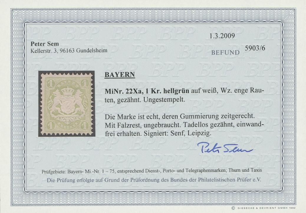 | Zusatzinformationen und Suchstichworte: | Ulrich Felzmann 37. e@uction 5. - 8. September 2023 Los 12043 Altdeutschland Bayern 1 Kr "enge Rauten" gelbgrün, ungebraucht in besonders farbfrischer Kabinett-Erhaltung, sign. Senf sowie Fotobefund Sem BPP "... einwandfrei erhalten" Ausruf 40,00 EUR |