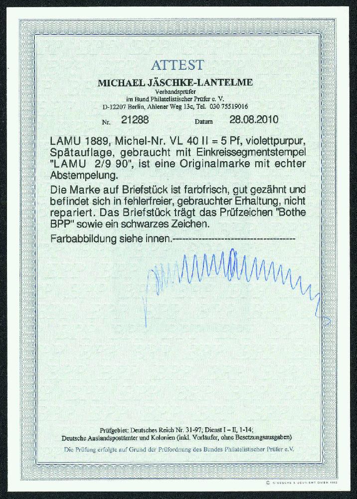 | Prüfgebiet: | Deutsche Auslandspostämter Lamu |