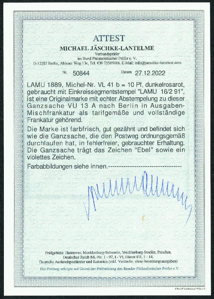 | Prüfer: | Jäschke-Lantelme, Michael (BPP (Bund Philatelistischer Prüfer)) |