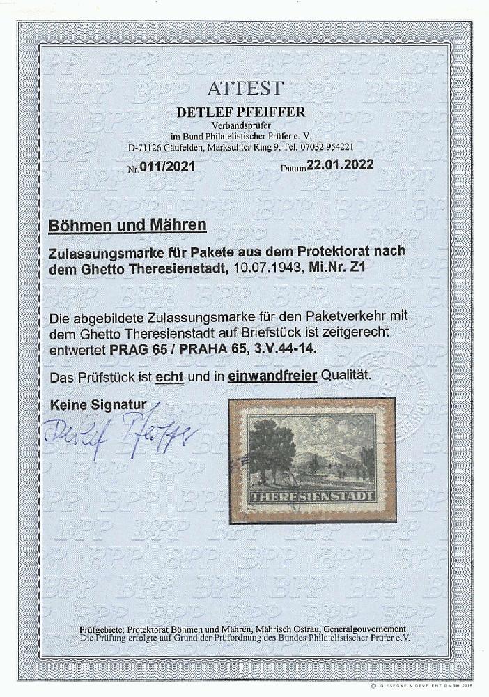 | Zusatzinformationen und Suchstichworte: | Alexander Voigt Los 0000102284 Böhmen und Mähren Theresienstadt Zulassungsmarke für Pakete aus dem Protektorat Böhmen und Mähren nach dem Ghetto Theresienstadt / KL Theresienstadt, tadellos mit zeitgerechtem K1 "PRAG 65 / PRAHA 65, 3.V.44" auf Paketausschnitt. Fotoattest Pfeiffer BPP: "[...] auf Briefstück ist zeitgerecht entwertet [...] echt und in einwandfreier Qualität.". Unsigniert. Festpreis 350,00 EUR |