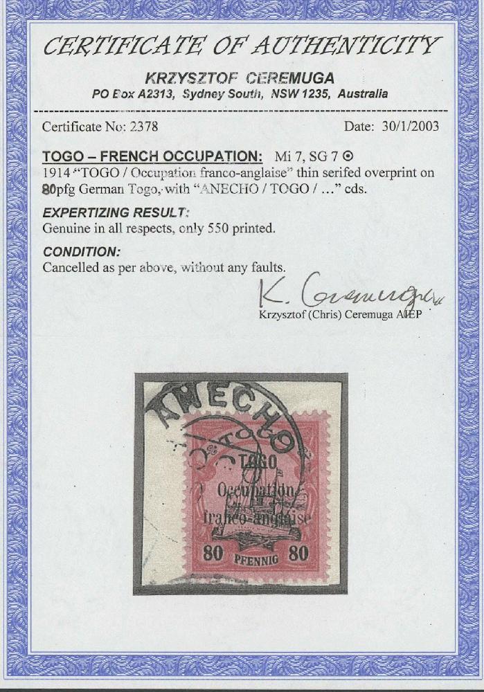 | Prüfgebiet: | Deutsche Kolonien Togo Französische Besetzung |