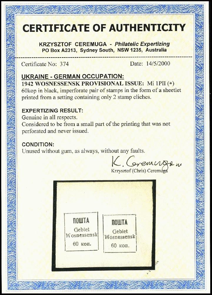 | Zusatzinformationen und Suchstichworte: | Dr. Reinhard Fischer 193. Auktion 21. - 22. Juli 2023 Los 4961 Deutsche Besetzung II. WK Ukraine Wosnessensk 60 Kop., ungezähntes Paar als Probedruck, ungebraucht ohne Gummierung - wie hergestellt, tadellose Erhaltung, Expertise Ceremuga "genuine in all respects. without any faults", Mi. 600.- - unterbewertet und kaum einmal angeboten! Ausruf 400,00 EUR |
