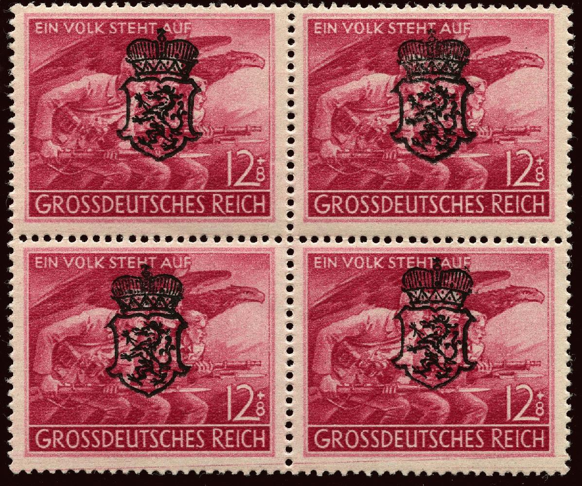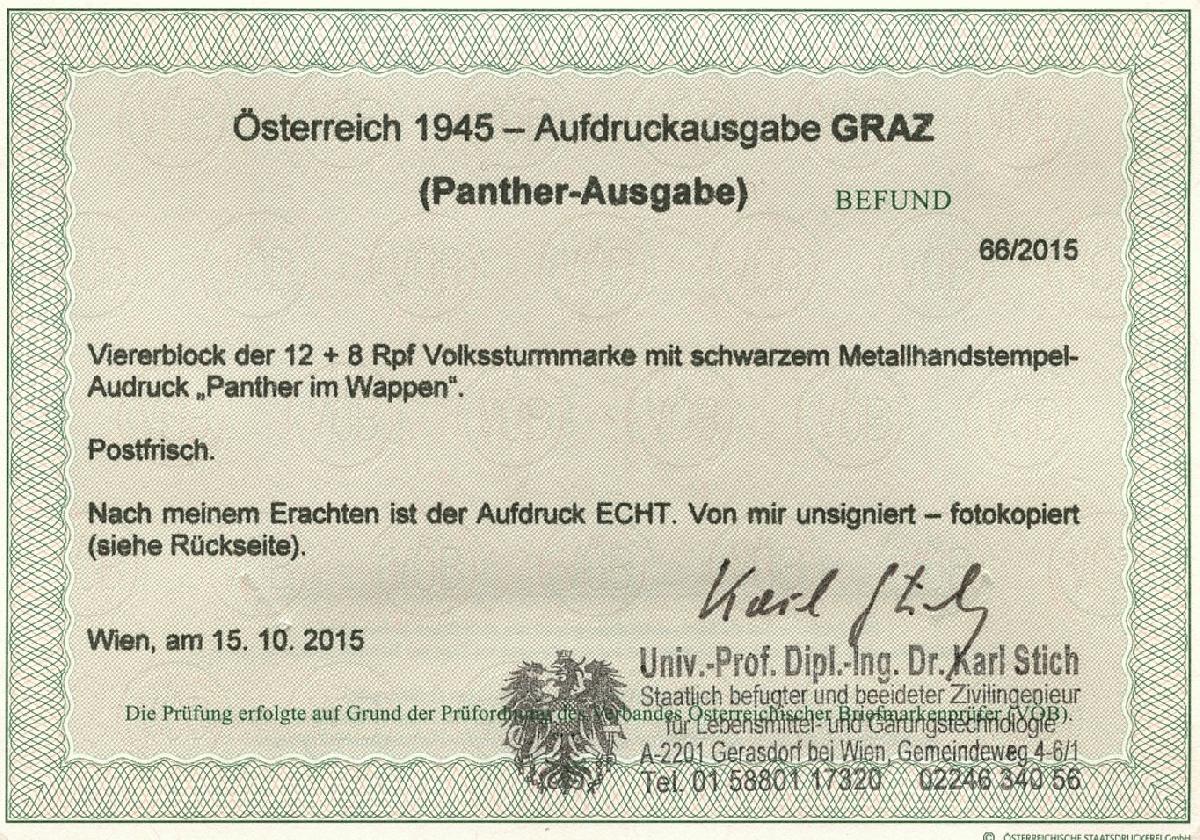 | Zusatzinformationen und Suchstichworte: | Philaseiten.de 5. Mai 1945, Lokalausgabe Österreich, Graz (Steiermark) Viererblock Mi. Nr. 908 mit "Panther" Aufdruck auf Volkssturmmarken (Volkssturmmänner im Schutze von Adler). |