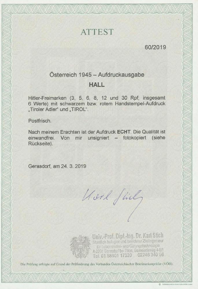 | Zusatzinformationen und Suchstichworte: | Ulrich Felzmann 37. e@uction 5. - 8. September 2023 Los 11550 Österreich Lokalausgaben HALL, Hitler 3, 5, 6, 8, 12 und 30 Pfg mit schwarzem oder rotem Handstempelüberdruck, 6 Werte postfrisch (!) in einwandfreier Prachterhaltung, unsigniert mit Fotoattest Dr. Stich (ANK/Soecknick 180,-) Ausruf 40,00 EUR |