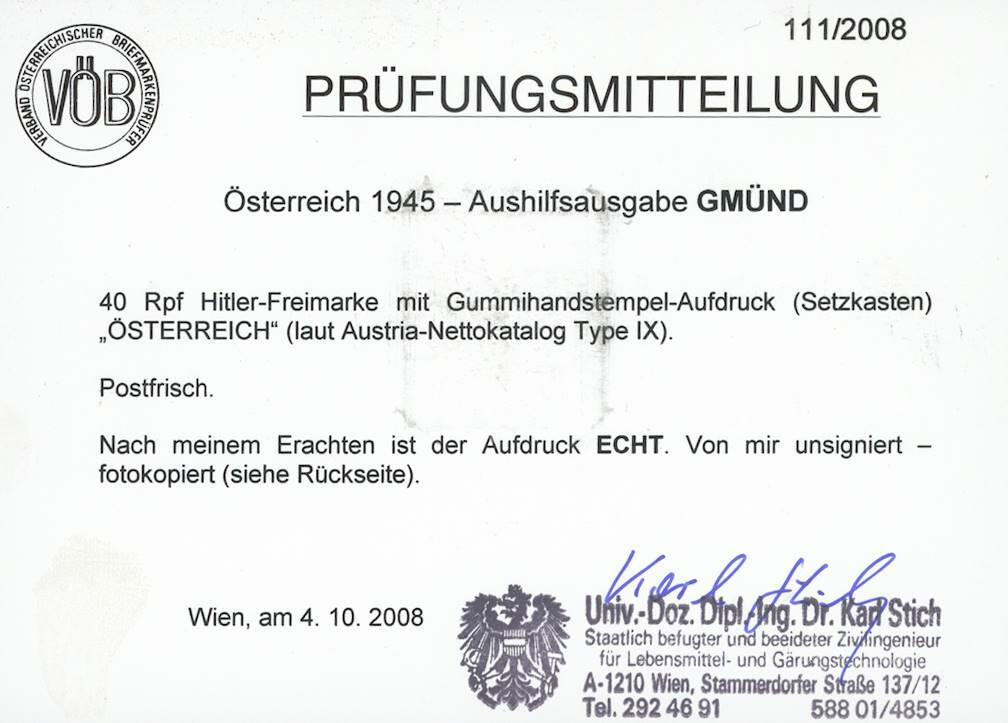 | Zusatzinformationen und Suchstichworte: | Ulrich Felzmann 37. e@uction 5. - 8. September 2023 Los 11549 Österreich Lokalausgaben GMÜND, Hitler 40 Pfg mit Gummi-Handstempelüberdruck in Type IX, postfrisch (!) in einwandfreier Prachterhaltung, unsigniert mit Fotobefund Dr. Stich Ausruf 50,00 EUR |