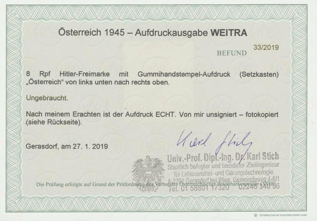 | Zusatzinformationen und Suchstichworte: | Ulrich Felzmann 37. e@uction 5. - 8. September 2023 Los 11559 Österreich Lokalausgaben WEITRA, Hitler 8 Pfg mit Gummihandstempelaufdruck in ungebrauchter Prachterhaltung, sign. Kosel sowie Fotobefund Dr. Sthttps://www.briefmarken-atteste.de/st/373645/1134/2/429d67aa_h.jpgich (ANK/Soecknick 400,-) Ausruf 80,00 EUR |