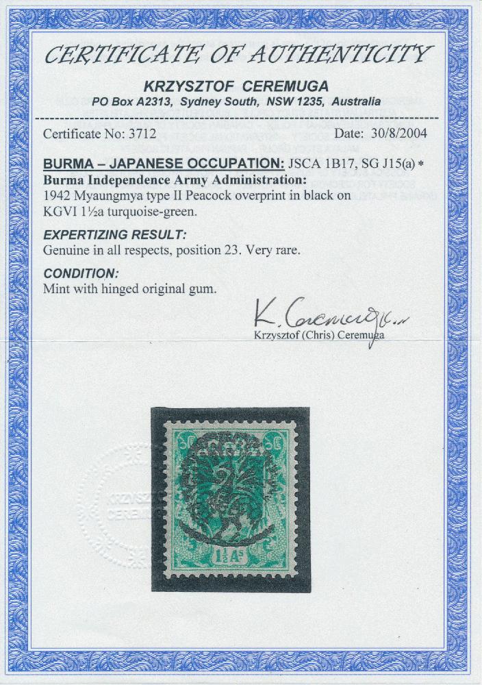 | Zusatzinformationen und Suchstichworte: | Doreen Royan & Associates Shop - Online Los 751278 (D) Birma Burma/Japanese Occupation 1942 King George VI 1 1/2a. turquoise-green. Overprint Peacock Myaungmya Type 2. Superb mint condition. Ceremuga Certificate No. 3,712 (2004) and KGVI Expertising Certificate No. 1799/09-14 (2014). VERY RARE Festpreis 950,00 GBP |
