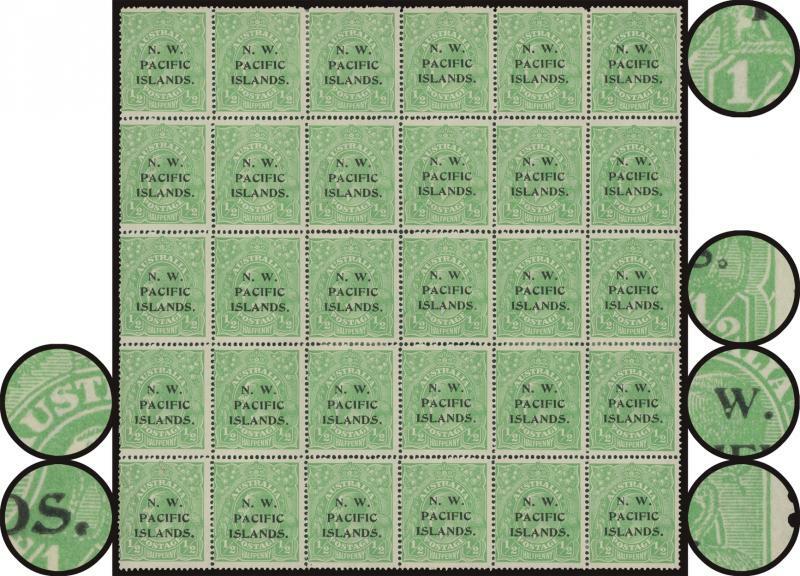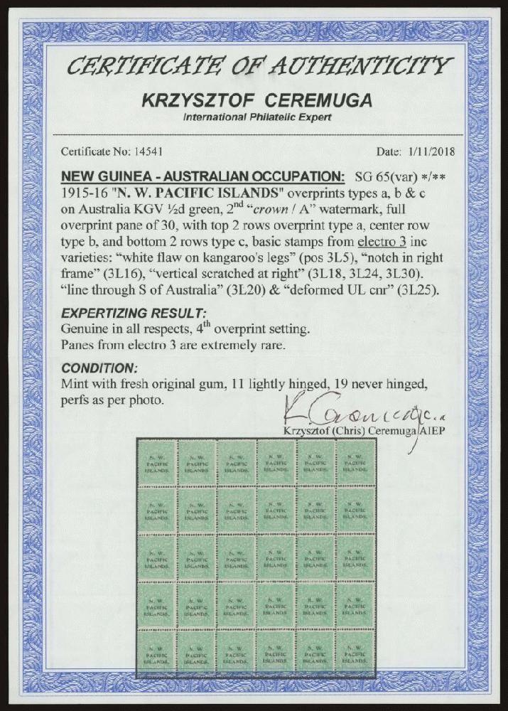 | Zusatzinformationen und Suchstichworte: | 252. Abacus Auktion 28. - 30. Juni 2023 Los 1100 Neuguinea 1915-16 on KGV Heads ½d bright green SG 65 Fourth Setting (Types c at base) complete forme of 30 from the upper-left pane of Electro 3 Pos [1-30] with ACSC-listed varieties Flaw on Kangaroo's Feet Pos [3L5], Notch in Frame at Right Value Tablet Pos [3L16], Line in Upper Loop of 'S' of 'AUSTRALIA' Pos [3L20], Deformed Upper-Left Corner Pos [3L25] and Vertical White Scatches through Right Side Pos [3L18/24/30] but before the Cracked Electro in Left Wattles Pos [3L19], also Hollow Stops on units 6 9 12 16 18 20 & 27 and overprint varieties Void in 'W' [22] & Broken Stop after 'S' [26], minor perf re-inforcing between a few units, the majority are unmounted, Cat £90+ for mounted 'normal' stamps (ACSC $5250 for the varieties without overprint mounted). Chris Ceremuga Certificate (2018) states "Panes from Electro 3 are extremely rare" Zuschlag 2.300,00 AUD |