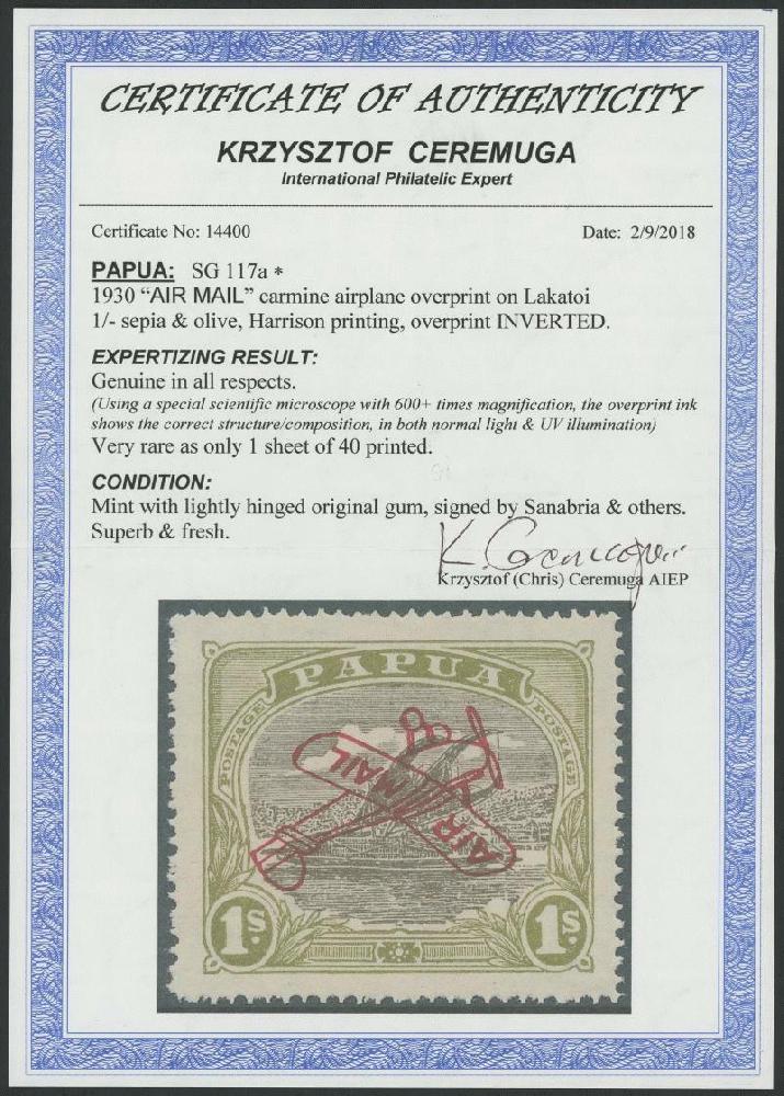 | Zusatzinformationen und Suchstichworte: | 252. Abacus Auktion 28. - 30. Juni 2023 Los 1313 Papua 1930 Aeroplane Overprints Harrison Printings 1/- sepia & olive with the Overprint Inverted SG 117a, unusually well centred, a few characteristic irregular perfs at left, lightly mounted with guarantee handstamps of Sanabria - who split the sheet - Gibbons New York and Kessler. Superb! Chris Ceremuga Certificate (2018) states "very rare as only one sheet of 40 printed". We sold examples from the collections of Tim Rybak, Peter Troy, Raymond Biggs and Paul Zatulove for $14,375 $16,100 $17,250 and $14,560 respectively Ausruf 10.500,00 AUD |