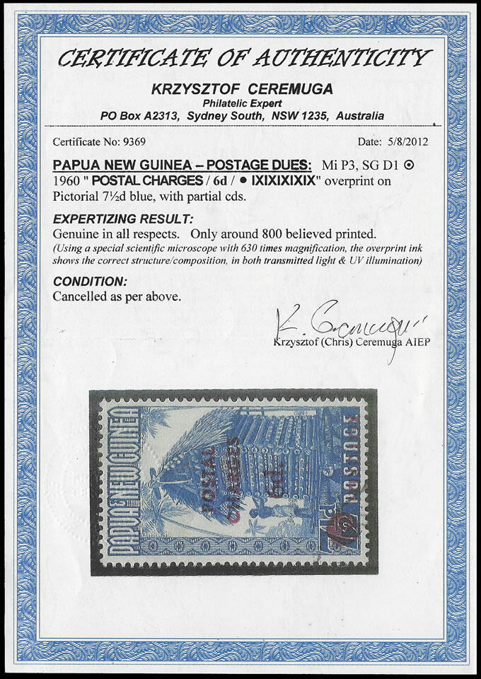 | Zusatzinformationen und Suchstichworte: | Filat AG Shop Neu Los 5960 (D) Papua Neuguinea POSTAGE DUES: 1960 6d on 7½d Type 1 red surcharge (SG D1). Superb U example with neat corner cds. A rare stamp, only 800 overprinted. Photo-cert: Ceremuga AIEP. (cv£450). See image of certificate below Festpreis 625,00 CHF |