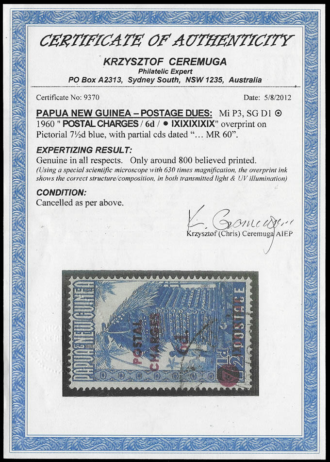 | Zusatzinformationen und Suchstichworte: | Filat AG Shop Neu Los 5961 (D) Papua Neuguinea POSTAGE DUES: 1960 6d on 7½d Type 1 red surcharge (SG D1). VF/U example with neat corner cds. A rare stamp, only 800 overprinted. Photo-cert: Ceremuga AIEP. (cv£450). See image of certificate below Festpreis 600,00 CHF |