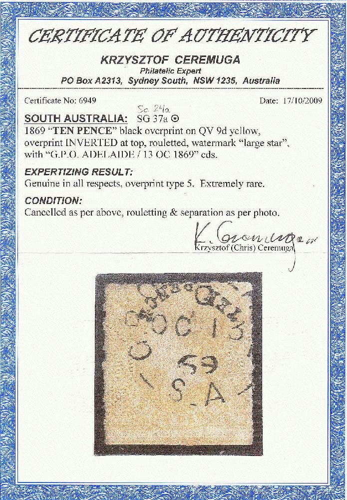 | Zusatzinformationen und Suchstichworte: | 19. classicphil GmbH Auktion 12. - 13. September 2023 Los 1062 Südaustralien 1869, zehn PENCE in schwarz auf 9 d, blassgelb, abweichend Aufdruck kopfstehend oben, schwarz ccs G.P.O. ADELAIDE/13 OC 1869, Wasserzeichen großer Stern, durchstochen, sehr frisch und gesucht, Prüfungsbefund Ceremuga, Kabinett! Schätzpreis 9,000 EUR Ausruf 2.800,00 EUR |