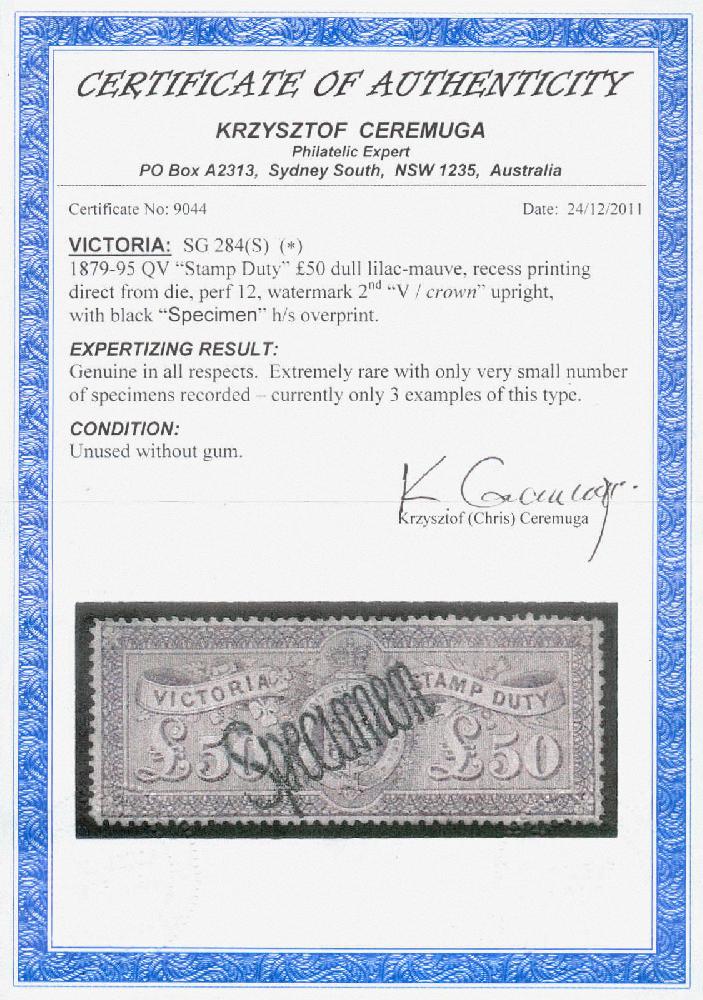 | Zusatzinformationen und Suchstichworte: | 19. classicphil GmbH Auktion 12. - 13. September 2023 Los 1119 Victoria 1884, Stichtiefdruck £50 matt lilarosa, Steuermarke Ausgabe 1884, Wasserzeichen V über Krone aufrecht, Zähnung 12, ein ungebrauchtes Stück überdruckt bei große - Specimen - diagonal in schwarz, frisch und fein scheinend, ungebraucht ohne Gummi, eine sehr seltene Briefmarke - normal gestempelt £70 000, Ceremuga Bundesländer - nur ein sehr Kleinziffer von Exemplare verzeichnet - also -, augenblicklich nur 3 Stücke derartig -, Attest Ceremuga 2011, XF-SUP! Schätzpreis 4,000 EUR Ausruf 1.000,00 EUR |