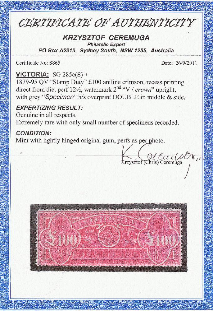 | Zusatzinformationen und Suchstichworte: | 19. classicphil GmbH Auktion 12. - 13. September 2023 Los 1121 Victoria 1884-1900, £100, aniline-crimson, Wasserzeichen stehend (V über Krone), ungebraucht mit Doppel- grauschwarz Handstempel Aufdruck Specimen, in Mitte und auf der rechten Seite, großer Teil Originalgummi, äußerst selten, sehr frisch und gesucht, Attest Ceremuga, Kabinett! Schätzpreis 4,000 EUR Ausruf 1.400,00 EUR |