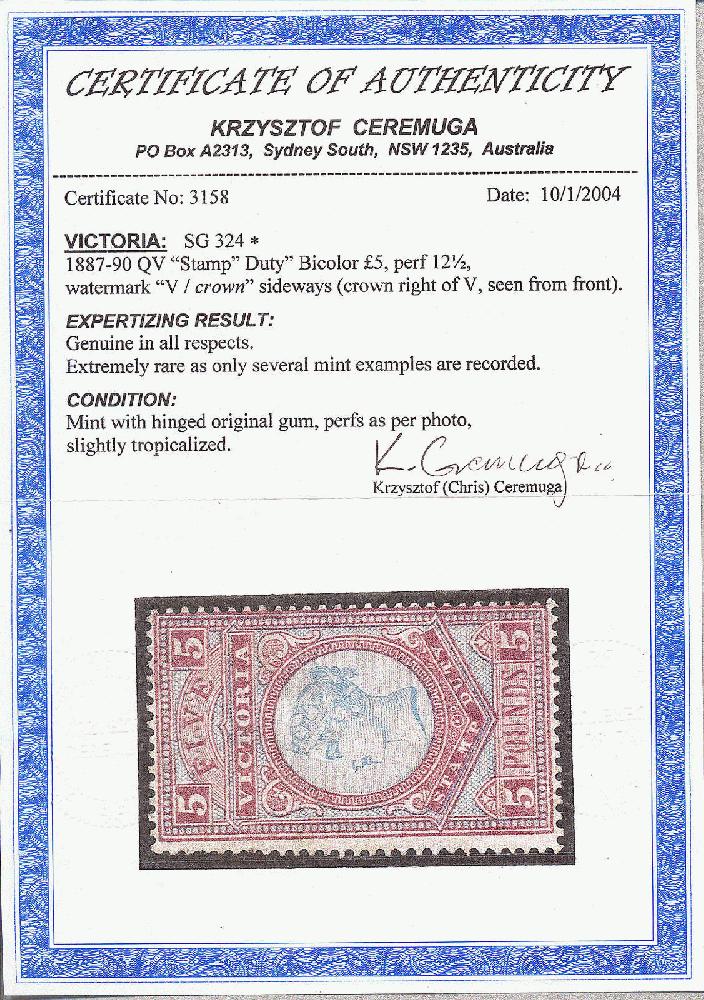 | Zusatzinformationen und Suchstichworte: | 19. classicphil GmbH Auktion 12. - 13. September 2023 Los 1122 Victoria 1886-96, £5, fahlblau und kastanienbraun, leicht zentriert rechts, Wasserzeichen liegend Krone richtigem ab V, Tip von tropicalization erkennbar auf substantielle Teil von die Originalgummi, großer Teil Originalgummi, äußerst selten, sehr frisch und gesucht, Prüfungsbefund Ceremuga, Kabinett! Schätzpreis 20,000 EUR Ausruf 7.000,00 EUR |